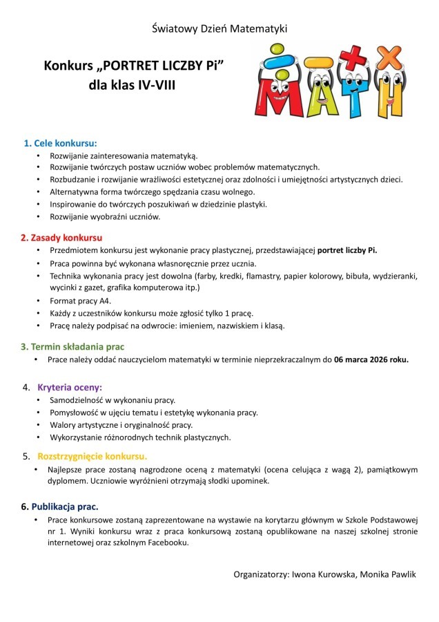 Konkurs matematyczny dla klas IV-VIII - "Portret Liczby Pi"