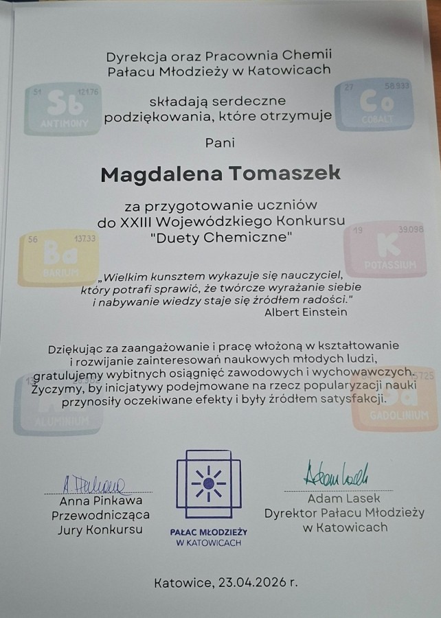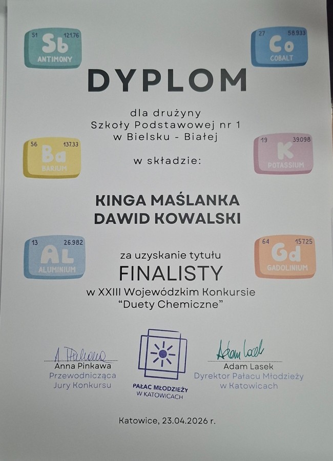 Uczniowie klasy 8d - Kinga Maślanka i Dawid Kowalski - zdobyli tytuł finalisty w XXIII Wojewódzkim Konkursie "Duety Chemiczne".