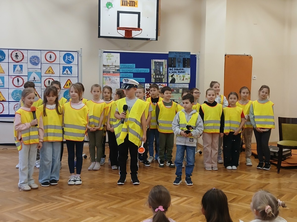 Klasy 2a i 2b przygotowały krótką inscenizację oraz piosenkę o zasadach ruchu drogowego. Dzieci pokazały, że naprawdę wiedzą, jak ważne jest noszenie odblasków, prawidłowe przechodzenie przez jezdnię i uważność na drodze. Gość docenił ich zaangażowanie i pomysłowość.