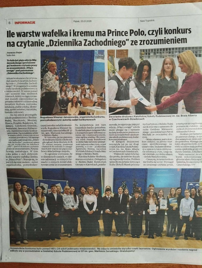 Emilia Krzyżek, uczennica klasy 8a, zajęła III miejsce w Powiatowym konkursie czytania prasy ze zrozumieniem "Włącz uwagę". Konkurs ten już po raz piąty został zorganizowany przez panią Bogusławę Wiesner-Januszewską ze Szkoły Podstawowej nr 37 w Bielsku-Białej oraz pod patronatem "Dziennika Zachodniego". Zadania polegały na wyszukiwaniu odpowiedzi na trudne pytania w artykułach prasowych. Emilka znalazła się w gronie najlepszych uczestników!