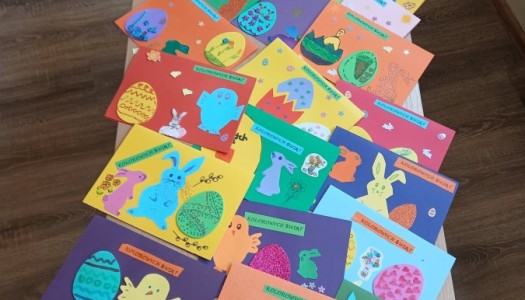Uczniowie udzielający się w ramach szkolnego koła wolontariatu własnoręcznie wykonali kartki okolicznościowe dla emerytowanych nauczycieli n...